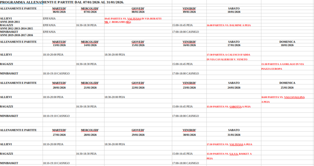 E’ appena terminata la settimana dedicata al nostro Super Camp che già si è messa in moto la macchina organizzativa per il Camp….Natalizio! Sono stati 5 giorni (+1) intensi, pieni e divertenti. Al mattino, dopo un oretta di attivazione in gruppo e uno spuntino salutare a base di frutta, i gruppi venivano suddivisi per fasce d’età utilizzando chi il campetto di basket del Centro Sportivo e chi trasferendosi in palestra. A mezzogiorno in punto sontuoso pranzo e a seguire giochi di società e/o mega quizzoni con svariati temi che hanno allenato anche la mente e la prontezza di riflessi dei nostri atleti. Dalle 14 gruppi nuovamente divisi e inversione dei campi/palestre di utilizzo con aggregamento dalle 16 per merenda ristoratrice e conclusione giornata. Giovedi bella escursione in quel della Forcella di Peia con super camminata che ha messo alla prova i muscoli di gambe, caviglie e polpacci dei nostri atleti (ed anche di allenatori e accompagnatori!!). Sabato mattina consueta e gioiosa festa conclusiva a base di giochi, consegna gadget, chiacchiere e meritati spritz per i numerosi genitori presenti! Un ringraziamento ai Coach Marco Merelli e Chiara Savoldelli, agli assistenti Thomas Techel e Arianna Savoldelli; a Paola, impeccabile organizzatrice come sempre, e a tutti i ragazzi che han partecipato. Un ringraziamento speciale alla gastronomia “Da Sophie” di Cene (sublimi i vostri pranzi!), al Comune di Peia per l’utilizzo della palestra e alla cooperativa Scacco Matto di Bergamo per la concessione all’utilizzo dei campi di calcio e basket con annessi spogliatoi. Qui sotto un ampia carrellata di foto che testimoniano benissimo quanto i nostri ragazzi si siano divertiti. Buona estate a tutti e mi raccomando, ci vediamo a settembre per una nuova ed entusiasmante stagione baskettara targata ABC Atletic Basket Casnigo!